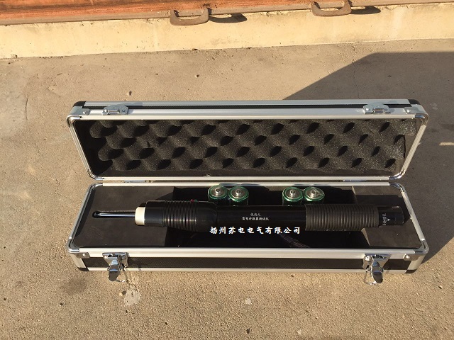 電源開關(guān)設(shè)在器身與頭部之間,任意方向旋轉(zhuǎn)90度,聽到“喀嚓”聲后即表示電源接通,反之為電源關(guān)閉。使用前先在尾部插入接地線并與地接好,根據(jù)計(jì)數(shù)器高度在未接通電源前將頭部伸縮導(dǎo)電桿拉出到合適長度。接通電源后綠燈亮,待紅燈亮(約3~8秒)即可通過頭部伸縮導(dǎo)電桿對避雷器計(jì)數(shù)器進(jìn)行測試。該儀器無須關(guān)閉電源可反復(fù)進(jìn)行測試(每次充電時導(dǎo)電桿應(yīng)離開試品)。該儀器采用一號電池四節(jié)供電,可供大于2000次的放電測試。若電池電量不足時會延長充電時間,應(yīng)及時更換。建議:長時間不用應(yīng)把干電池從儀器中取出!