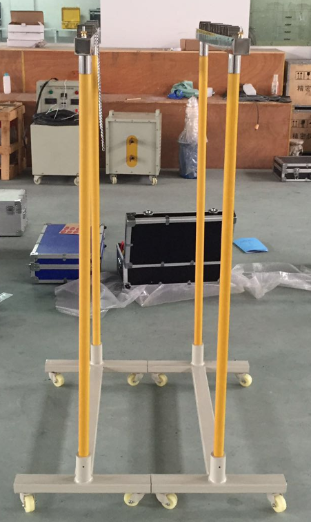 1、根據(jù)試品絕緣桿規(guī)格調(diào)整好兩各絕緣桿固定架之間的距離,試驗架上的高壓連接電極和接地電極,分別使用高壓連接棒和接地線鉗與高壓試驗電源和接地排連接。